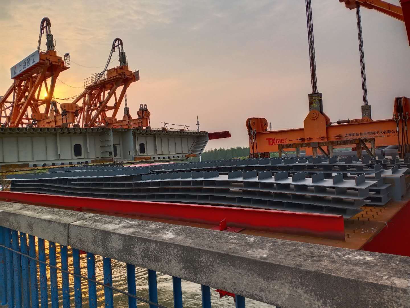 5月20日,經過三個小時的提升施工,重達126噸的主跨中段順利提升到位,標志著由上海建工基礎集團承建的平申線航道(上海段)整治工程泖港大橋主橋順利合龍。我公司負責主橋中跨鋼箱梁安裝施工,采用4臺250t同新橋面吊機進行安裝就位,共17段鋼箱梁,標準段重175噸,共16段,中間合龍段重126噸,共1段。