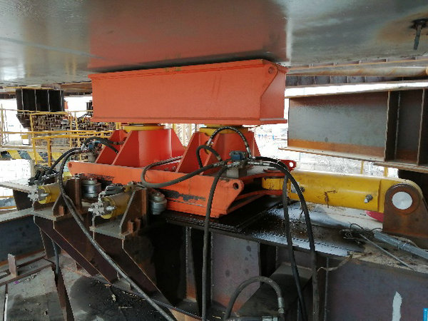 6月29日8時58分,溫泉東路與高爾夫路交叉處,411米長、總重1865噸的鋼箱梁在空中經(jīng)過3個月的“螞蟻搬家”后,克南高架東延二期五層立交正式合龍。中交三航局負責總承包,我公司負責第三層和第四層共四段鋼箱匝道梁頂推安裝施工,采用步履式多點頂推法進行頂推就位,例如:PES12- PES15部分,跨徑為44+56+44m,橋?qū)挒?.5m,挑臂1.37m,梁高為2.5m,總重約690t。梁底平曲線為25米長緩和曲線+120米長半徑200米圓曲線,豎曲線從-2.00%到3.60%,凹曲線半徑800米,線型較為復(fù)雜,頂推過程中需要多次調(diào)整標高,采用前端加裝導(dǎo)梁,步履式頂推安裝到位方式施工。