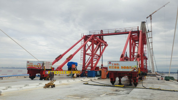 舟岱跨海大橋主通航孔橋自2017年9月開(kāi)建,大橋設(shè)計(jì)為三塔雙索面鋼箱梁斜拉橋,全長(zhǎng)1630米,主跨2×550米。大橋主墩承臺(tái)共有3個(gè)10萬(wàn)噸級(jí)防撞鋼套箱,采用內(nèi)外雙層鋼套箱防撞設(shè)計(jì),單個(gè)承臺(tái)套箱重達(dá)2600噸。本公司負(fù)責(zé)舟岱大橋3#、4#、5#主橋墩橋面鋼箱梁施工,總共起吊94個(gè)梁段。梁段重量不超過(guò)320t。一個(gè)斷面布置2臺(tái)橋面吊機(jī),共計(jì)采用12臺(tái),單臺(tái)吊機(jī)設(shè)計(jì)額定起重量160t,提升油缸額定起升荷載350t。本次鋼箱梁合龍采用自然合龍方案,按次邊跨、邊跨、中跨合龍順序進(jìn)行,至多偏差3毫米,趕在臺(tái)風(fēng)季來(lái)臨前實(shí)現(xiàn)合龍,比計(jì)劃工期提前一個(gè)月,為今年年底全橋合龍夯實(shí)了基礎(chǔ)。