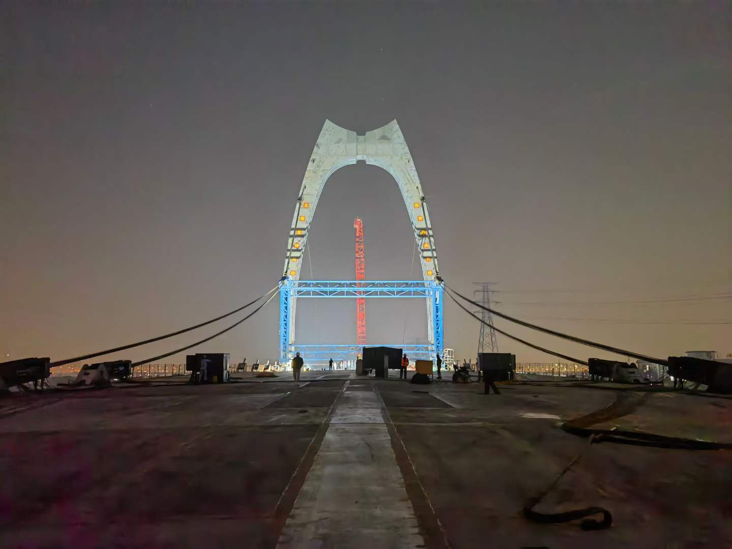 2022年1月18日,經(jīng)過(guò)16小時(shí)的連續(xù)施工,寧波西洪大橋主橋鋼塔完成了節(jié)點(diǎn)性工序—主塔90°豎轉(zhuǎn),轉(zhuǎn)體施工由上海同新機(jī)電控制技術(shù)有限公司負(fù)責(zé)完成。主塔外形為弧形門式,采用“臥式拼裝,整體豎轉(zhuǎn)”