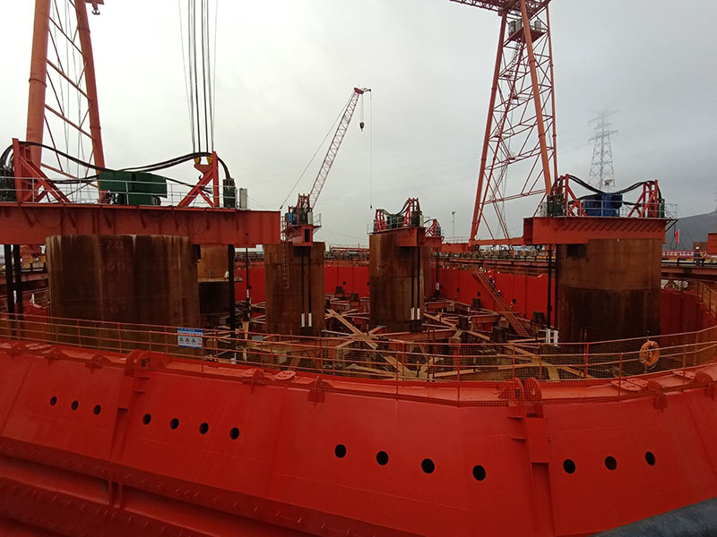 2024年3月15日,經(jīng)過7個小時的連續(xù)下放作業(yè),重達(dá)4500噸5號主塔鋼套箱順利下放到設(shè)計標(biāo)高。5號主塔墩鋼圍堰采用永臨結(jié)合方案,利用防撞箱作為主體防撞結(jié)構(gòu),同時兼作承臺施工用的鋼圍堰側(cè)板,并利用承臺范圍內(nèi)既有自浮式鋼桁架施工平臺的下弦桿作圍堰底龍骨、上弦桿作圍堰內(nèi)支撐系統(tǒng)。鋼圍堰體積大,下放難度高,下放共設(shè)置12個下放吊點(diǎn),在六根接高鋼護(hù)筒頂部安裝分配梁和提升下放系統(tǒng),并通過24臺350噸連續(xù)提升油缸同步作業(yè),整體下放重量約4500噸,下放總高度14.9米,后期下放系統(tǒng)兼作圍堰封底吊掛系統(tǒng)的一部分。將再布置24個吊掛點(diǎn),共72個吊掛點(diǎn),吊掛系統(tǒng)安裝好后,進(jìn)行封底作業(yè)。
