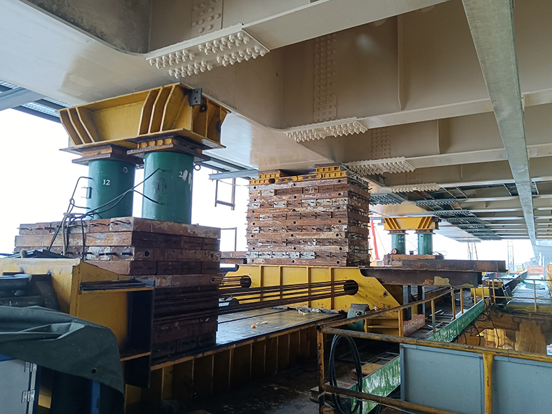 2024年8月28日,國內(nèi)最大跨度的公軌兩用多塔剛性懸索橋一一浙江瑞安永寧大橋順利合龍。作為大橋建設(shè)的標(biāo)志性節(jié)點(diǎn),為下一步建成通車奠定了堅(jiān)實(shí)基礎(chǔ)。永寧大橋主橋施工采用雙向頂推施工工藝,其頂推施工最大跨度達(dá)130米,頂推鋼梁總重量達(dá)4.67萬噸,臨時(shí)支墩單點(diǎn)支反力最大達(dá)到4270噸;單點(diǎn)抄墊高度達(dá)到3.7米,超過1層樓的高度,是國內(nèi)唯一同時(shí)具備最大頂推跨度、最大支點(diǎn)反力、最大抄墊高度三大特點(diǎn)的頂推鋼桁梁橋,綜合頂推施工難度堪稱全國最高。永寧大橋跨江正橋全長1100m。采用兩端頂推方式,分別在北岸(溫州側(cè))、南岸(平陽側(cè))設(shè)置拼裝平臺(tái),然后相向往中間頂推,最后在A29~A30節(jié)間之間合攏。北岸桁梁頂推段全長342.75m。南岸桁梁頂推段全長536.25m。頂推時(shí)主橋和引橋簡支梁之間采用臨時(shí)連接形成連續(xù)結(jié)構(gòu)。