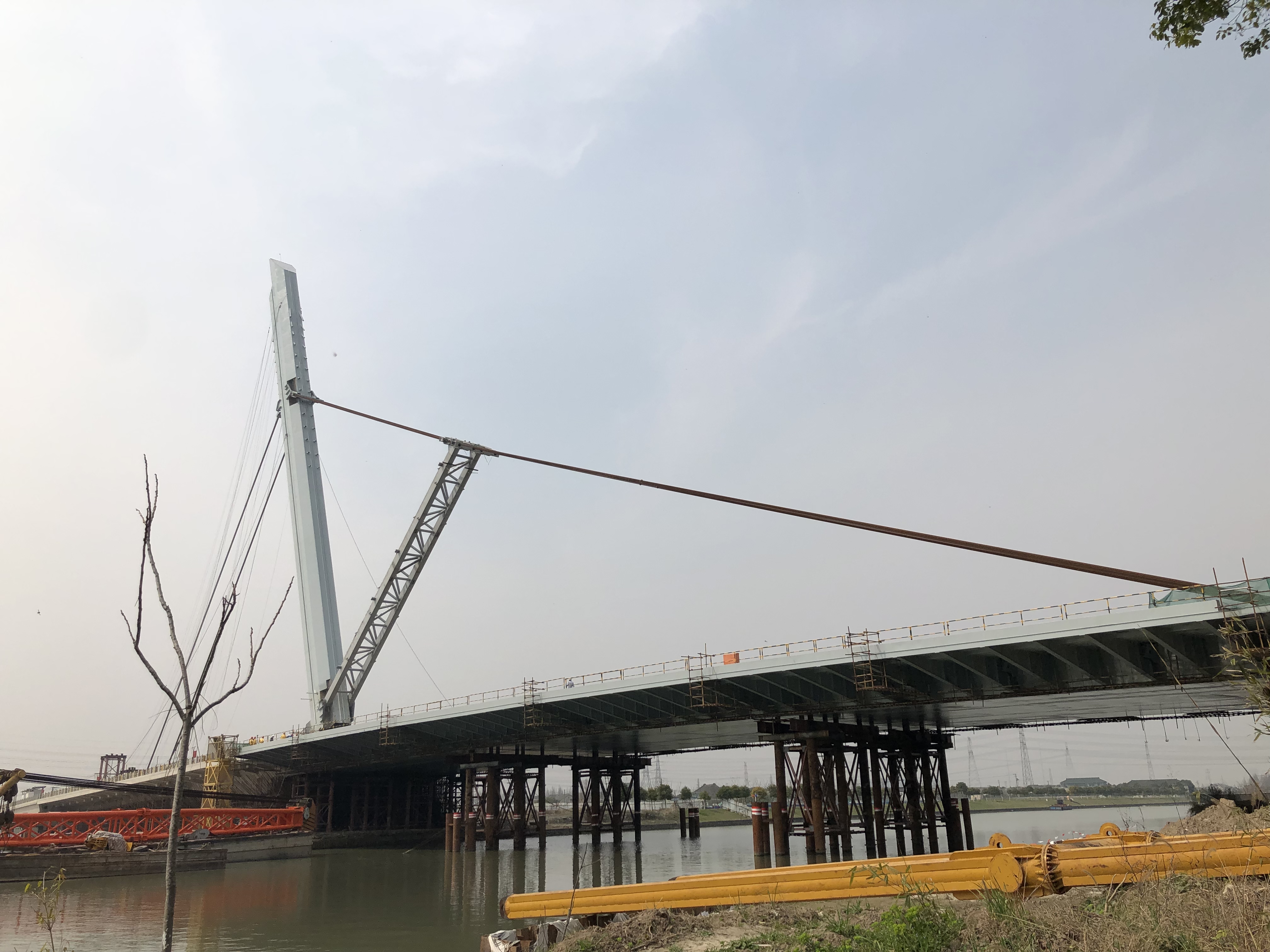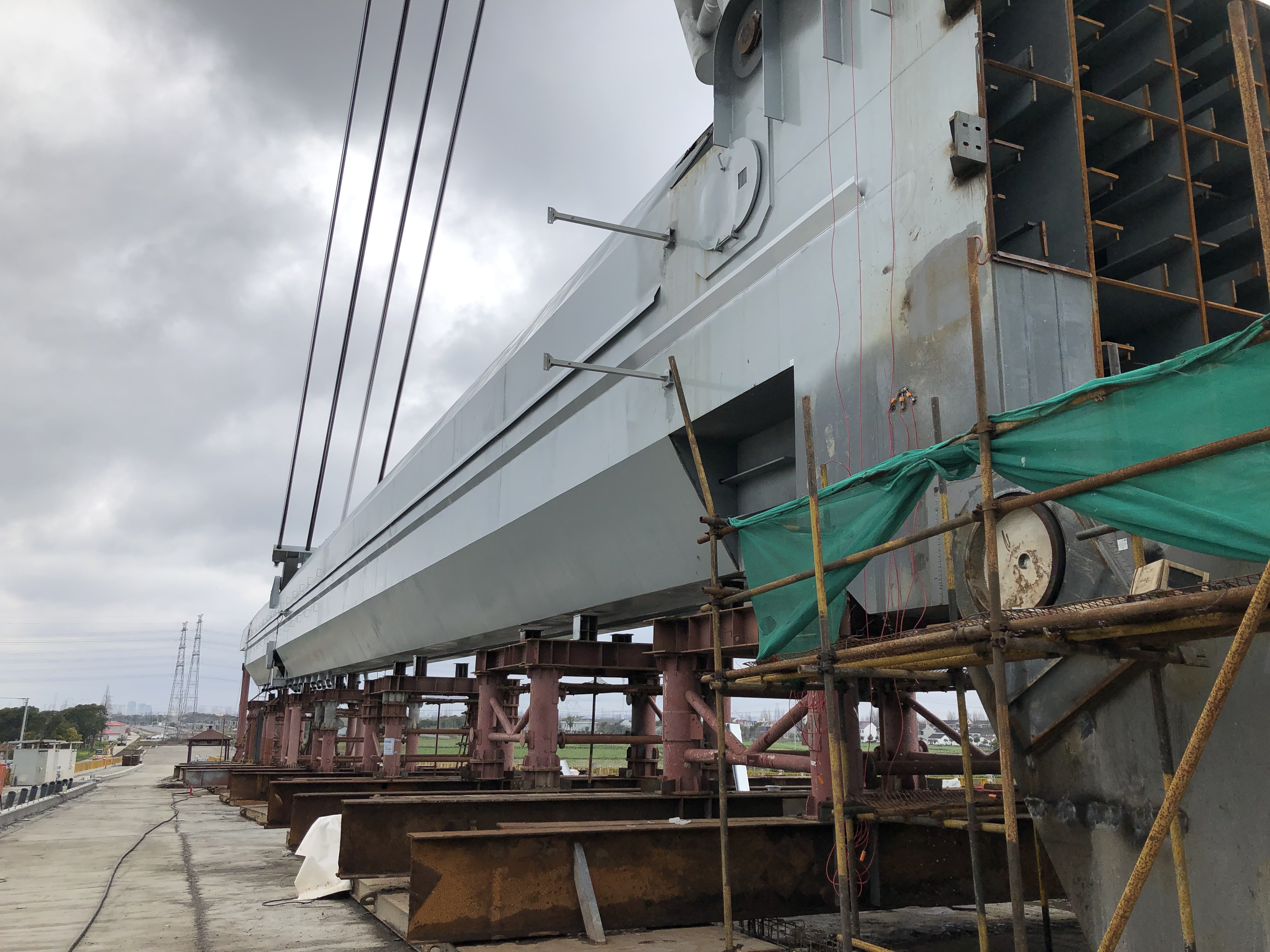 3月17日,經(jīng)過兩天的轉(zhuǎn)體施工,高104.028米、重約1200噸的鋼塔成功豎轉(zhuǎn)到82度,由上海建發(fā)集團(tuán)總包,上海洪浦鋼構(gòu)負(fù)責(zé)鋼結(jié)構(gòu)安裝施工,我公司負(fù)責(zé)主塔轉(zhuǎn)體提升施工項(xiàng)目的上海金匯港大橋主塔完成安裝。
