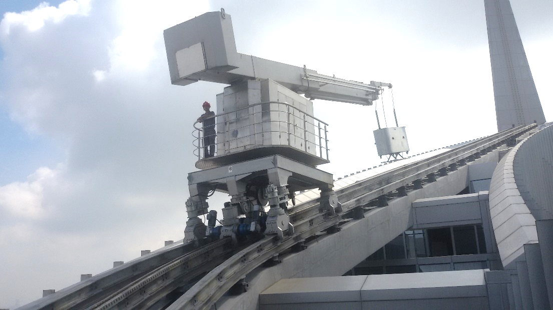CWGS250-X擦窗機(jī)是為佛山羅浮宮建筑而專門設(shè)計(jì)的,其主要組成為:起升機(jī)構(gòu)、斜爬行走機(jī)構(gòu)、主機(jī)回轉(zhuǎn)機(jī)構(gòu)、臂架機(jī)構(gòu)、吊籃、軌道、動(dòng)力及電氣系統(tǒng)、安全裝置等組成。